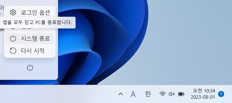 여기서 PC 끄기를 선택하면 완전히 꺼진다.