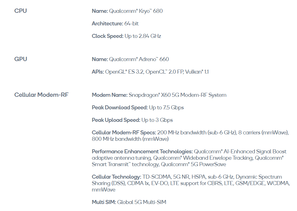 Qualcomm Kryo 585 Gold MP1 3.19 GHz + Qualcomm Kryo 585 Gold MP3 2.42 GHz + Qualcomm Kryo 585 Silver MP4 1.80 GHz