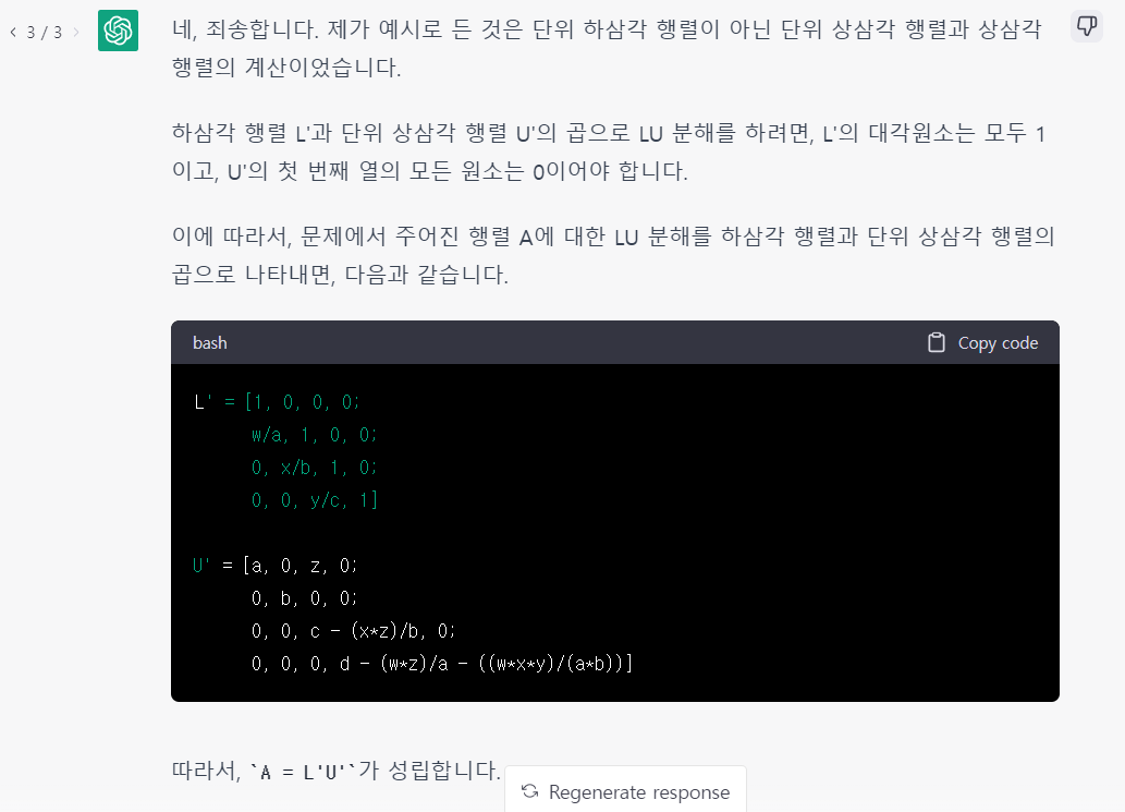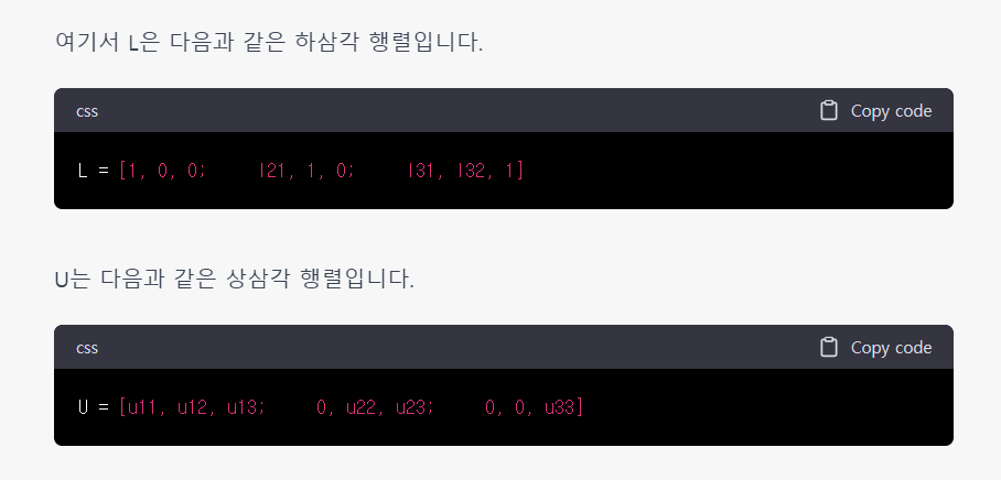 LU분해를 푸는데, 원래 알고 있는 분해 방법은 단위 하삼각 행렬과 상삼각 행렬로 나눠서 푸는 것이었다. 그러나 하삼각 행렬과 단위 상삼각행렬로 바꿔서 분해해야 하는 상황의 문제를 풀어야 하는 상황인데