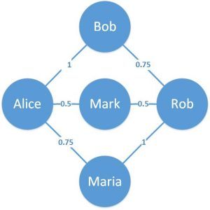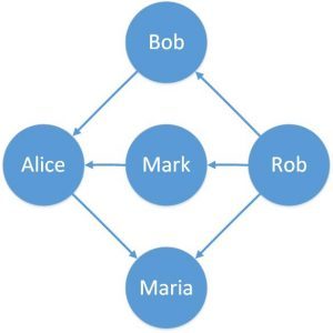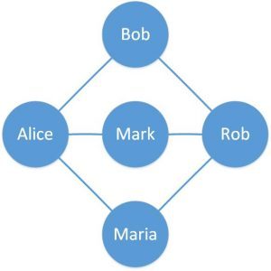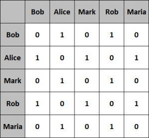 우선 대각성분(행과 열이 같은 성분, 예를 들면 1행 1열, 2행 2열....)은 모두 0이다. 당연하지만 자신과 자신은 간선으로 연결되어 있지 않기 때문이다. 여기서 몇 가지 예를 들면 Bob과 Alice는 직접 연결되어 있으므로 1이며, Bob과 Mark는 직접 연결되어 있지 않으므로 0이다.