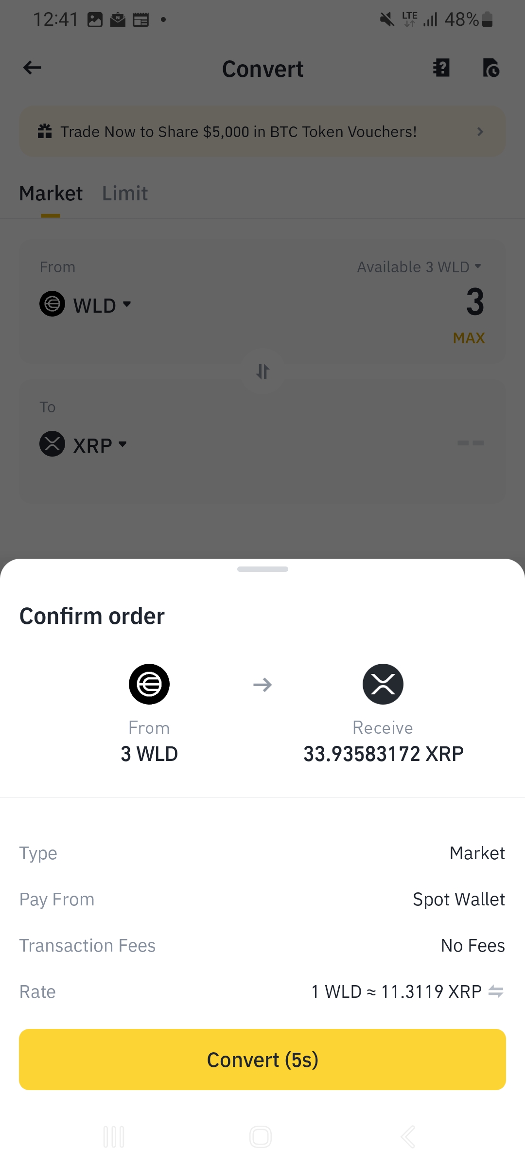 다음으로 리플으로 월드코인을 변환 후 업비트로 전송하는 과정을 거칩시다. 그러려면 convert 기능을 이용해서 바이낸스 상에서 월드코인을 리플로 바꿔야 합니다.