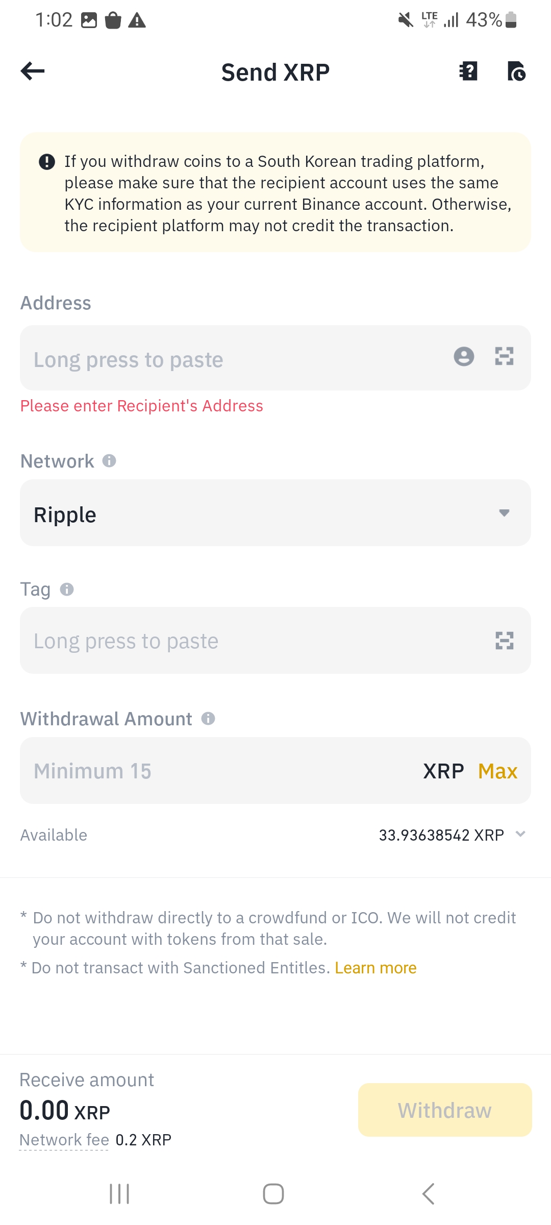 이렇게 되면 빈칸에 주소를 입력하도록 하는 칸이 있습니다. 여기서 우리는 바이낸스에 가입하고 월드코인을 받을 수 있는 지갑 주소를 찾아냅시다.