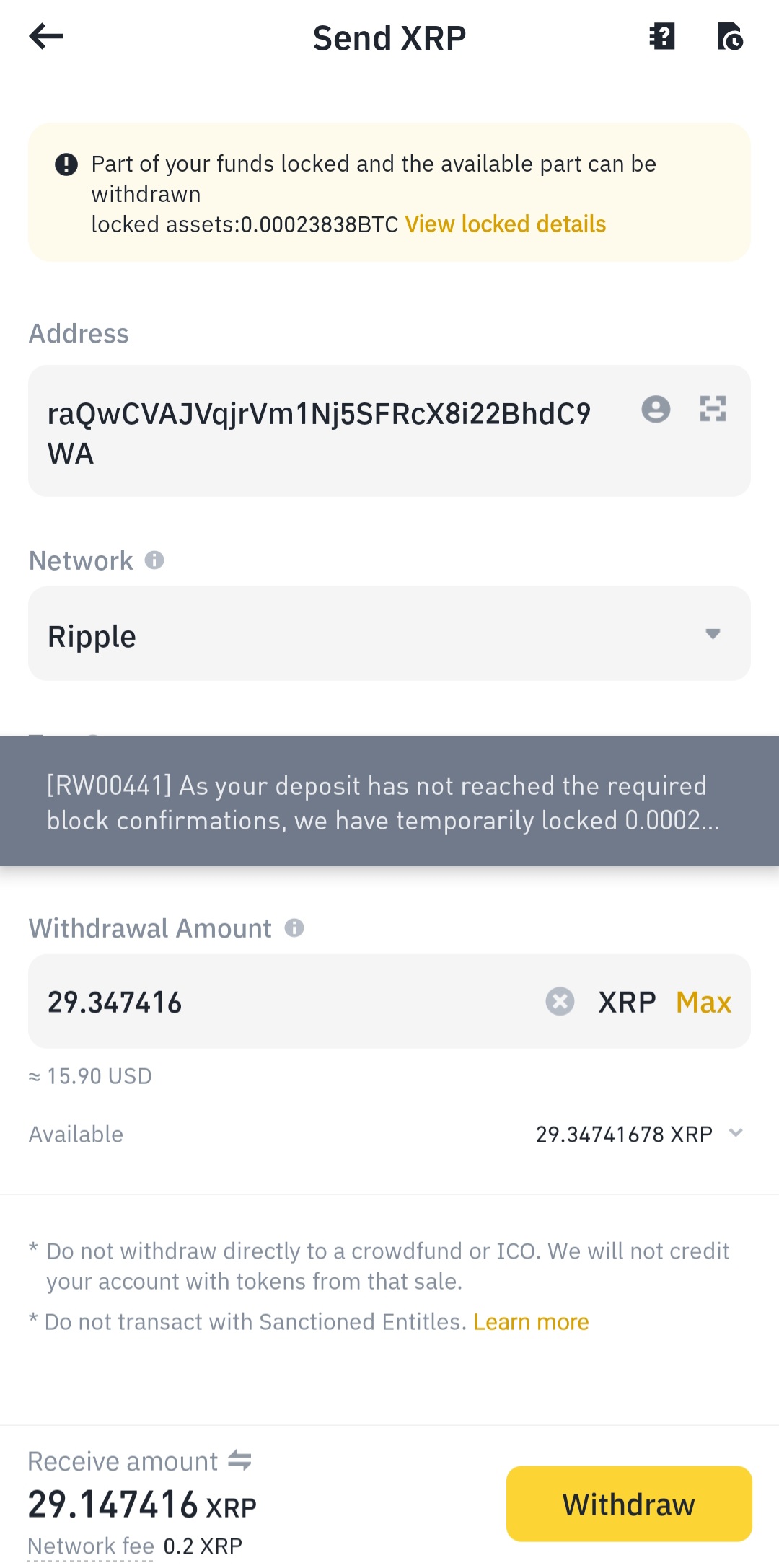 바이낸스에서 리플로 변환 후 업비트의 리플 지갑으로 보내려고 하는데 아래 사진처럼 출금이 동결된다는 메시지가 등장한다.