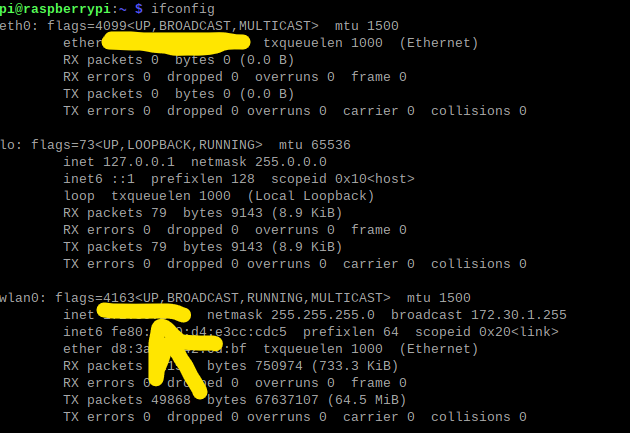 그리고 똑같이 라즈베리파이 터미널에서 ifconfig를 설치한 후, wlan0 부분의 inet 바로 옆의 숫자를 기억해 주세요