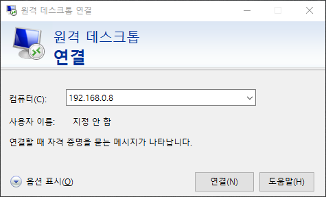 이후에 윈도우 원격 데스크톱 프로그램을 들어가서 라즈베리파이 ip를 입력 후 들어가서 id, pw 를 입력해 줍시다.