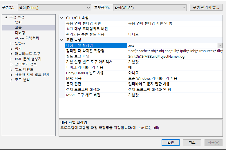 프로젝트 속성 -> 구성 속성 -> 고급 -> 문자집합 -> 멀티바이트 문자집합 사용