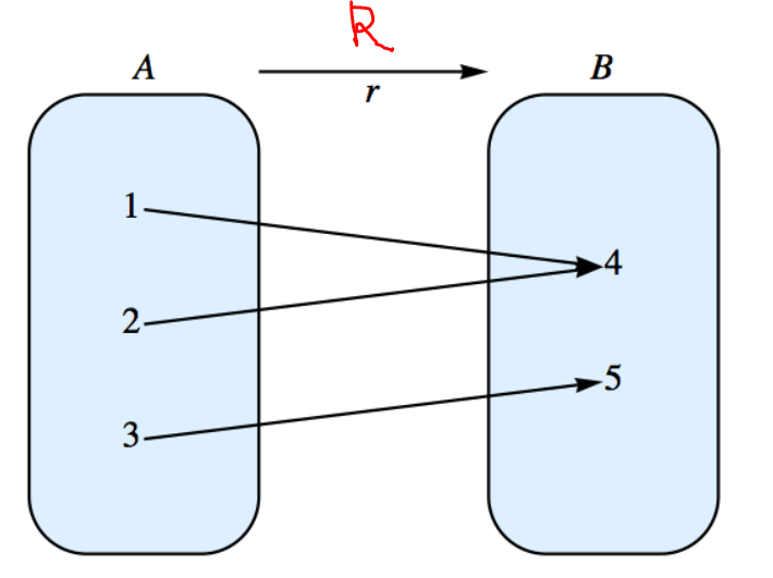 정의 5.1 (Relation) 집합 A와 B가 있을 때, 와 의 카테시안 곱()의 부분집합(subset) R을 A에서 B로 관계라고 한다. 또는 binary relations (이진관계, 이항관계)라고 한다.