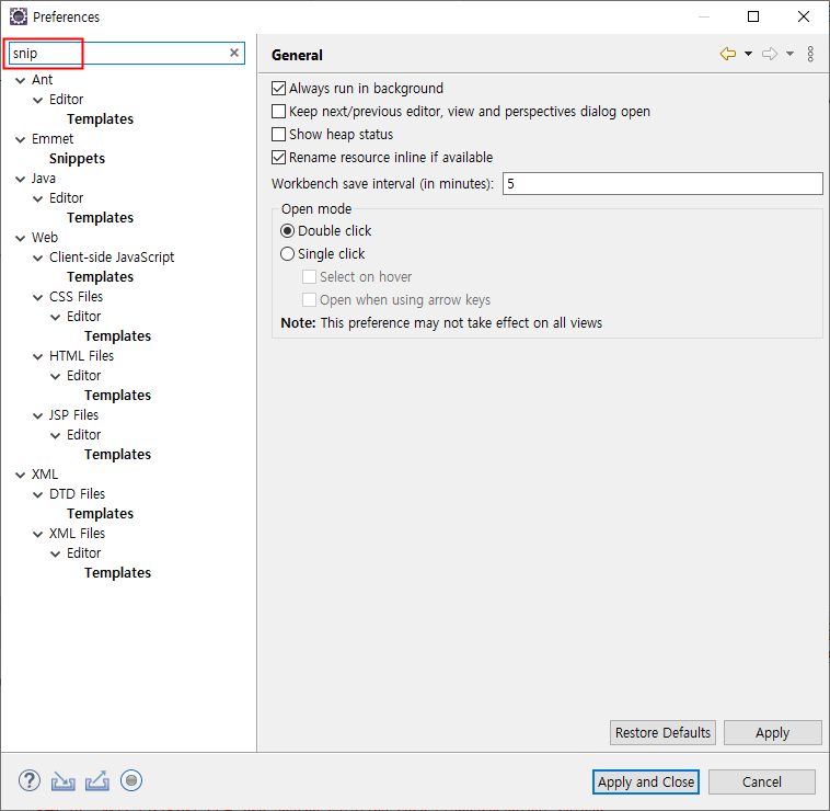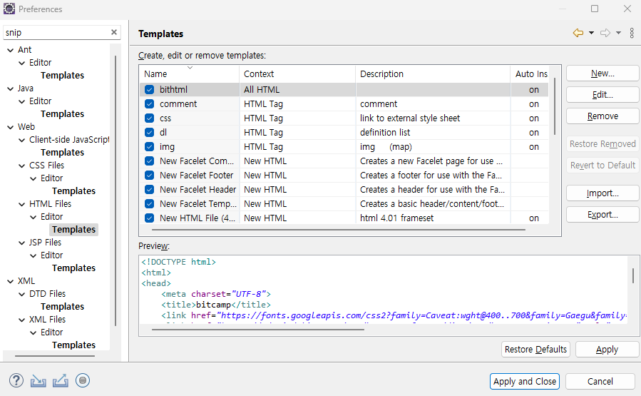 2. jsp 스니펫을 만들거면 => JSP Files > Editor > Templates