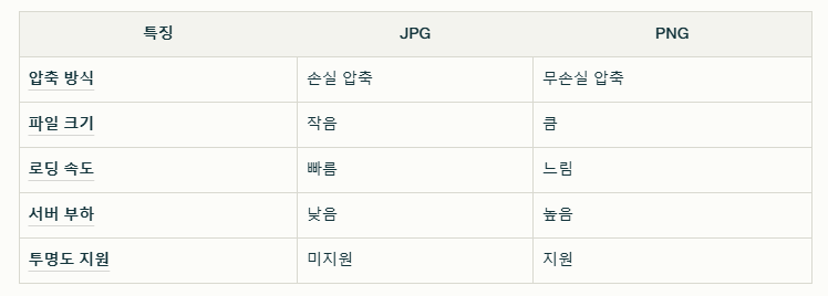 JPG 파일은 서버 부하를 줄이는 데 효과적입니다. 그 이유는 JPG가 손실 압축(Lossy Compression) 방식을 사용하여 파일 크기를 줄이기 때문입니다. 작은 파일 크기는 서버가 데이터를 전송하거나 처리하는 데 필요한 리소스를 줄여 웹사이트 속도를 높이고 사용자 경험을 개선합니다.