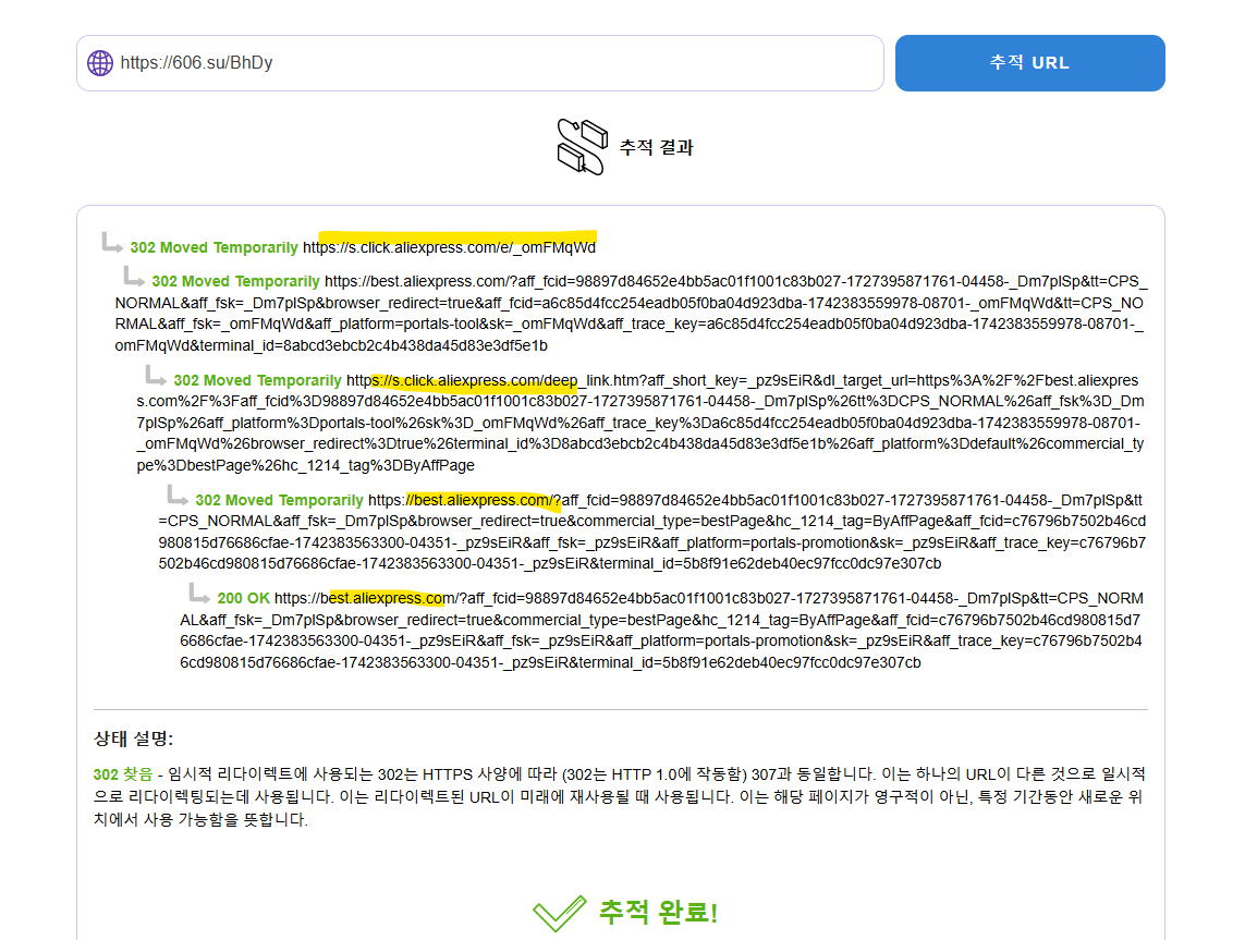 알리 쇼핑몰로 유도하는 광고 링크네요 물론 이 정도의 링크면 짜증이 조금 날 수 있지만 악의적인 루트라면 이러한 추적을 하지 않고 들어가는 것의 위험성이 매우 커질 수 밖에 없습니다.