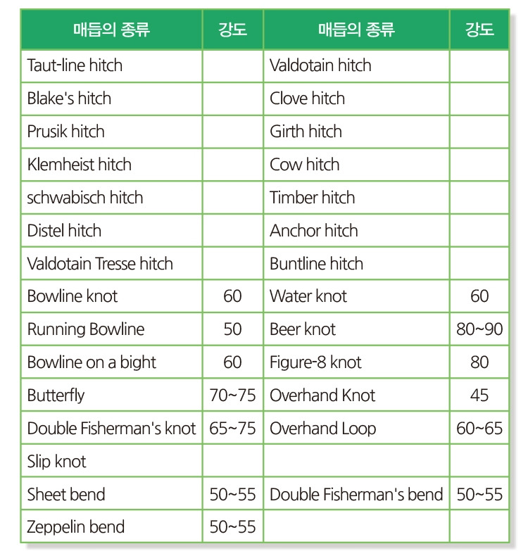 매듭의 강도는 매듭마다 매우 다양합니다. 작업자는 상황에 따라서 매듭법을 선택하게 됩니다.