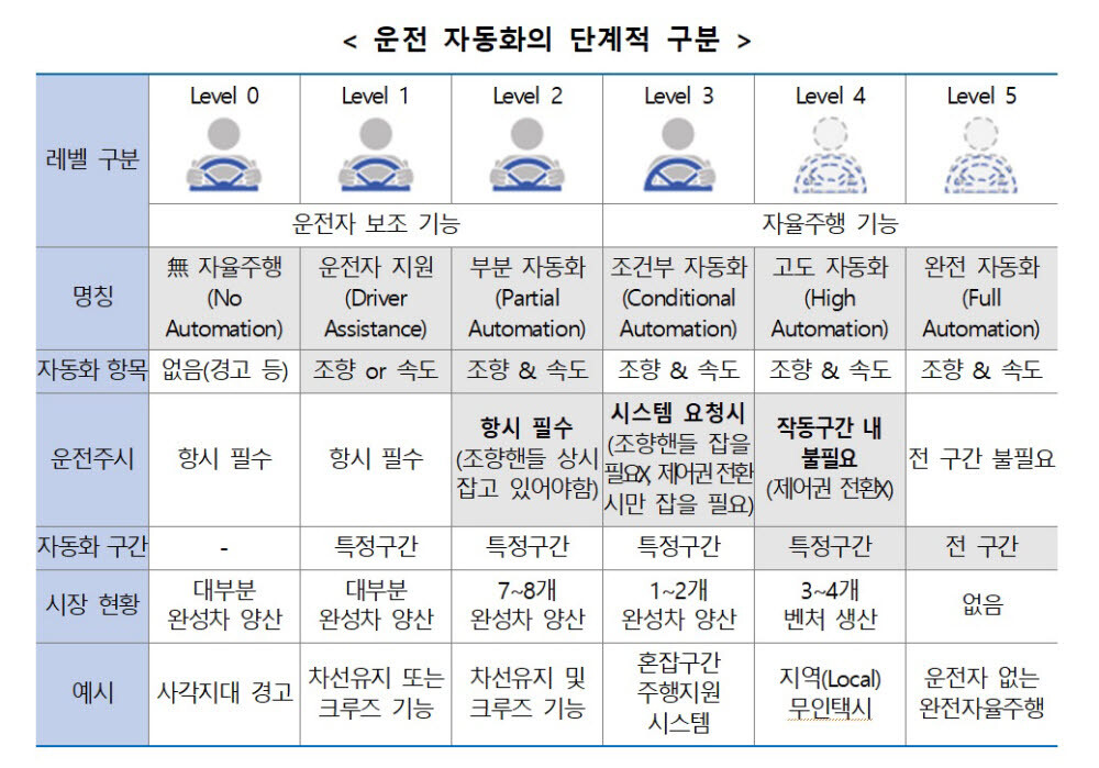 위의 분류기준은 미국자동차공학회(SAE)의 6단계 기준이다.