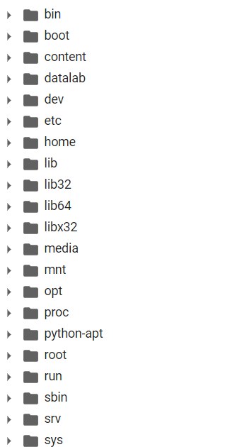 그렇기 때문에 대체적으로 리눅스의 파일 구조와 매우 유사한 형태를 보인다. 물론 완전히 같은 형태는 아니지만, 결국 코랩 역시 리눅스를 응용한 시스템이기 때문에 어느 정도 이해가 수반도리 때 더 효율적인 사용이 가능하다고 할 수 있다.