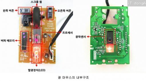 일반적으로 마우스의 구조가 저러한데, 위에서 클릭을 하면 내부의 버튼이 딸깍거리면서 돌아가는 구조이다. 그러나 어느 장비든지 마찬가지지만 내부 청소를 해주지 않으면 문제가 생기는 것은 당연하다. 그런데 대부분의 저가형 마우스들은 분해조립 자체가 불가능하게 되어있다.